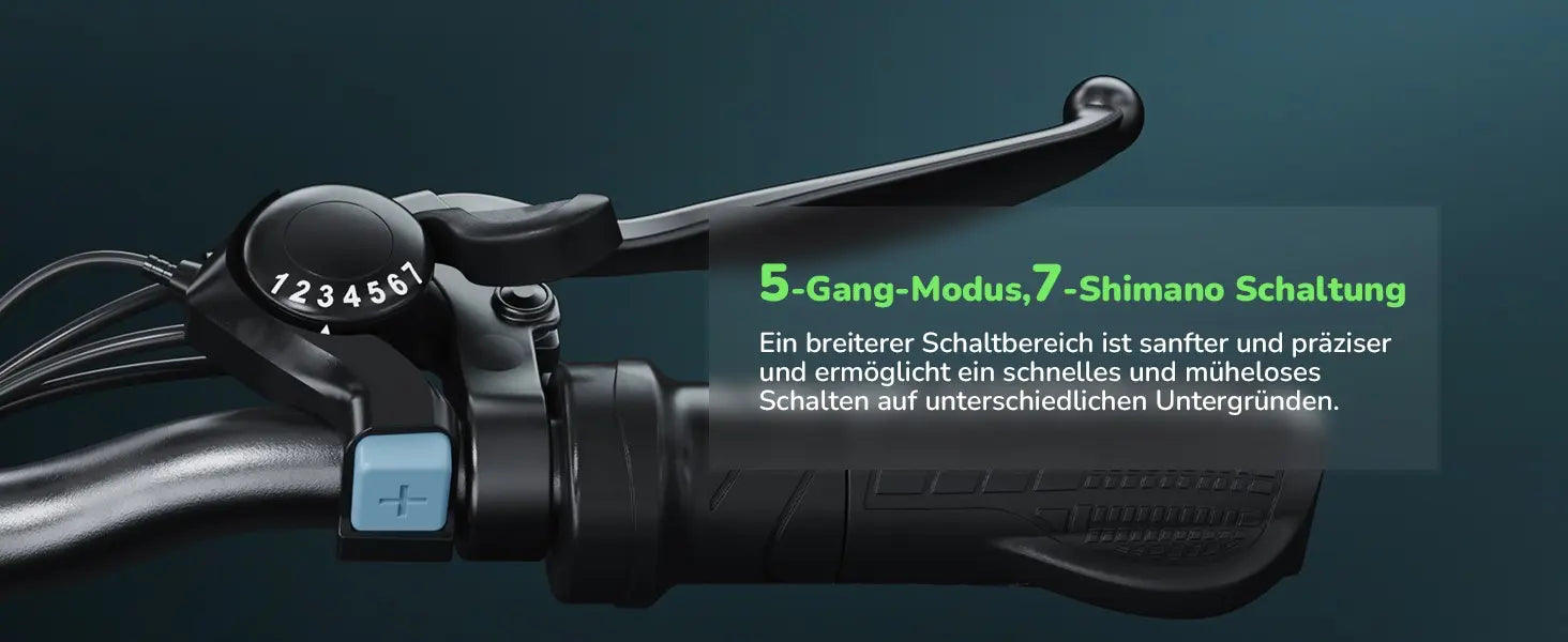 Fünf Leistungsstufen: 3,7/6,2/9,3/12,4/15,5 mph (6/10/15/20/25 km/h)